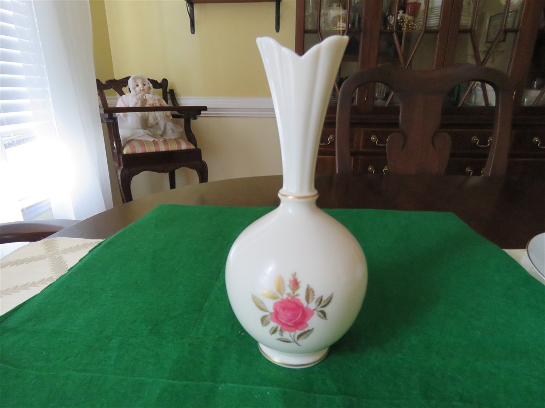 Bud Vase Lenox Rhodora Rose Dtes to 1940’s-1980’s Elegant and timeless, this Lenox Rhodora Rose bud vase brings classic beauty to any space. Standing approximately 8 inches tall, it features Lenox’s signature ivory fine china adorned with a delicate hand-painted pink rose and finished with lustrous 24K gold trim. This piece is in excellent condition, with no visible wear, chips, cracks, or fading—the gold detailing remains bright and the floral design vibrant. Perfect for displaying a single bloom or as a refined accent on a shelf, vanity, or table setting, this vase embodies the understated luxury Lenox is known for. A lovely addition for collectors or anyone who appreciates vintage floral décor. A graceful piece that adds charm without overwhelming—ready to display and enjoy.