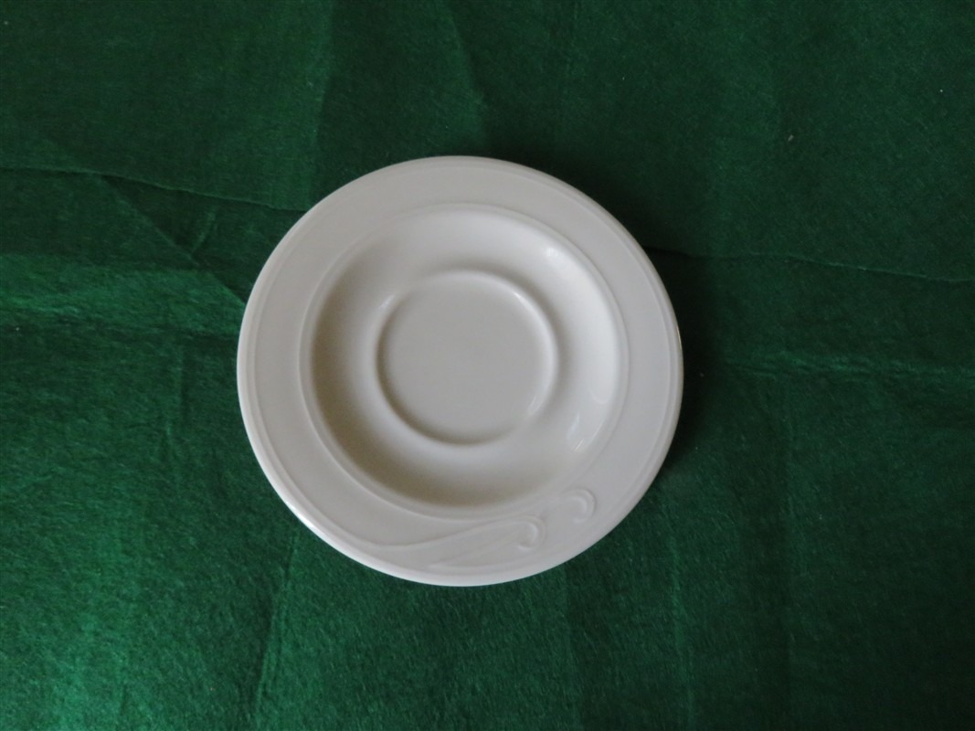 Homer Laughlin Lyrica Lead Free Restaurantware Saucer 5 1/2 inches diameter Cup 3 ¼ inches tall. 3 1/8 inches diameter. Plain ivory. Excellent condition. No visible wear. No chips, dings or cracks. Vintage piece must be considered as used. |