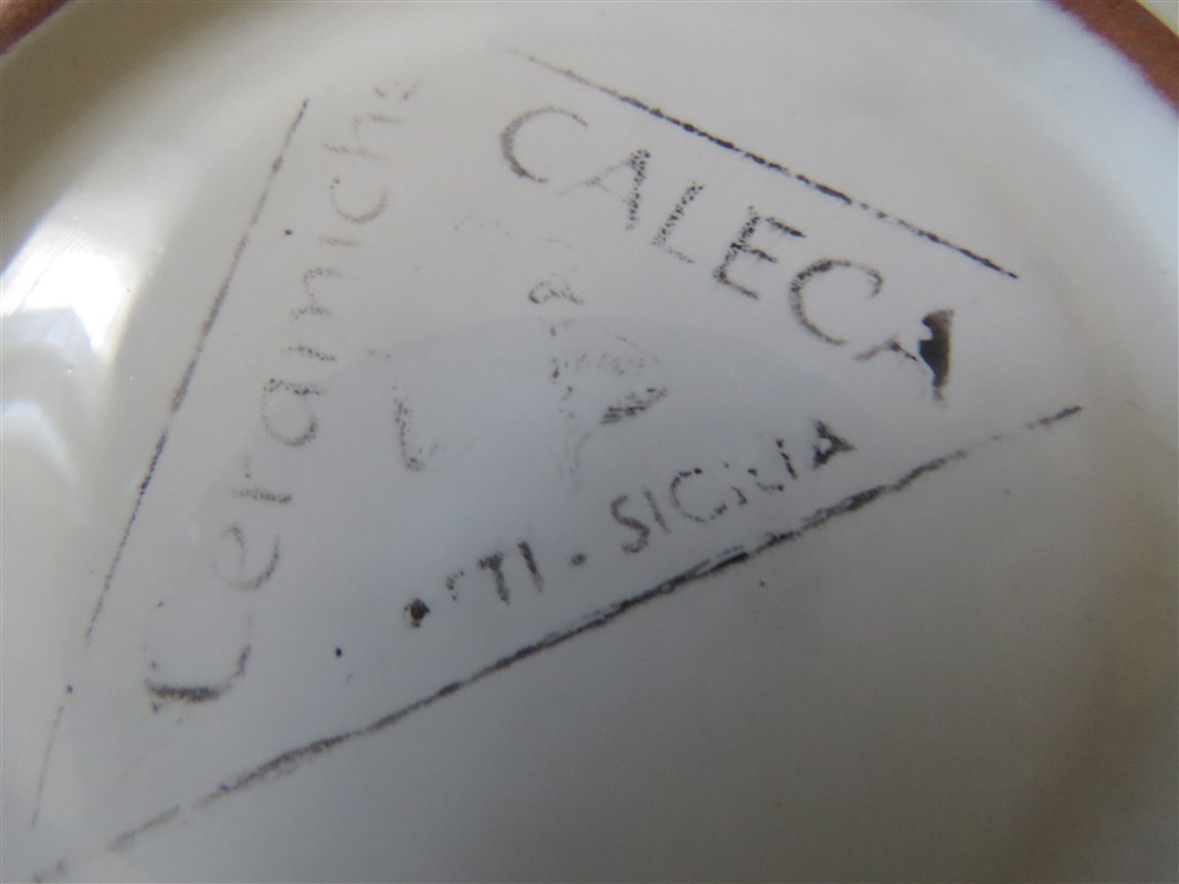Sicilia Yellow by Caleca Ceramiche Yellow rim. Made in Italy. 6 ¼ inches diameter. Cup is 4 inches diameter and 2 ¼ inches tall. Excellent condition. No cracks, dings, scratches, chips or crazing. Back stamp is worn. Vintage item must be considered as used. |