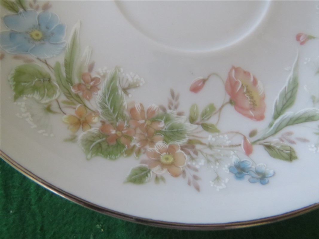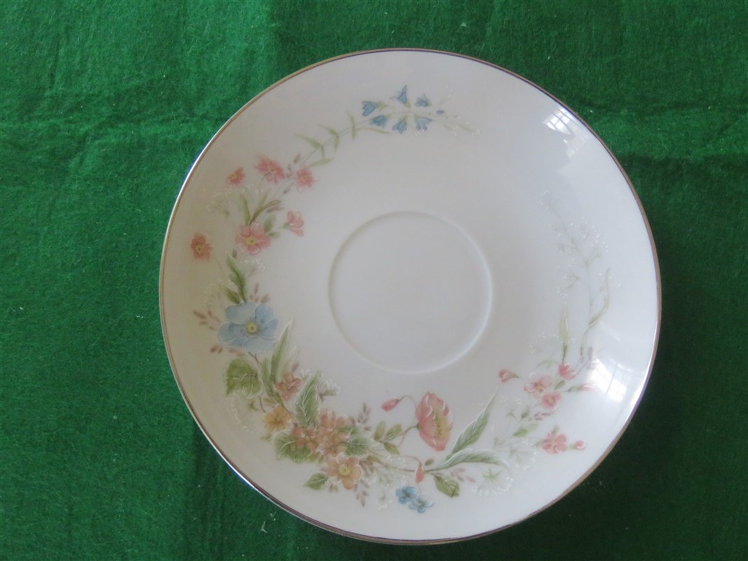 Cottage core floral bouquet almost encircling the entire saucer with a white body and platinum trim.